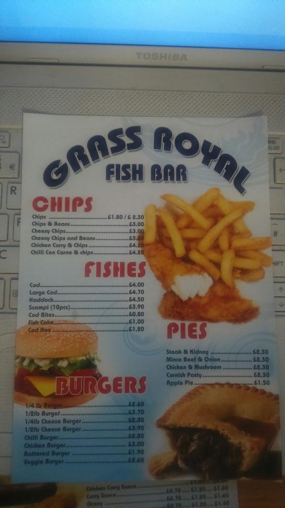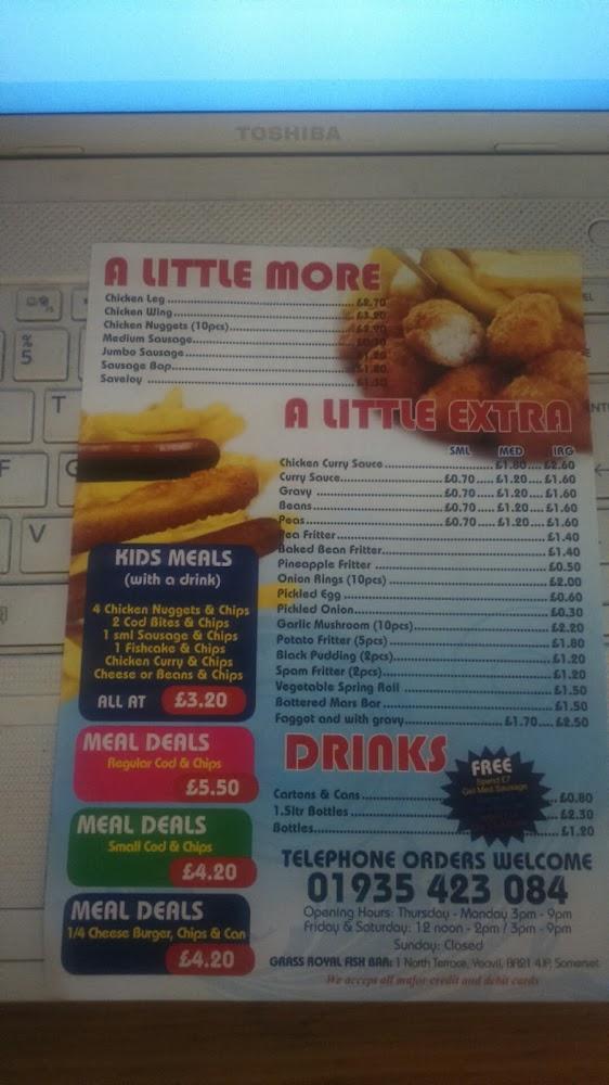 Grass Royal Fish Bar sits in a prime location on North Terrace, Yeovil. The establishment's charm and accessibility make it a favorite for both families and solo diners alike. With wheelchair-accessible entrance and generous free street parking, it ensures convenience for all visitors. The takeaway means you can enjoy a classic British meal wherever you choose. The welcoming atmosphere makes it an excellent spot for family outings or a quick bite with friends. The dining options include takeaway, delivery, and dine-in, accommodating varied schedules and preferences.